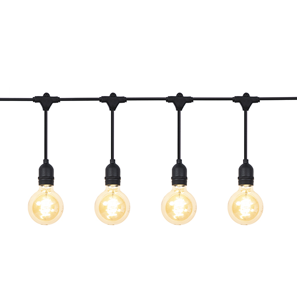 | Extended description: | Globes are 900mm apart You can join up tp 3x 10 meter pieces together. You can select warm white or daylight globes (sold seperately). There are 10 globes per 10 meter. The distance from the plug to the first globe is 1 meter. |