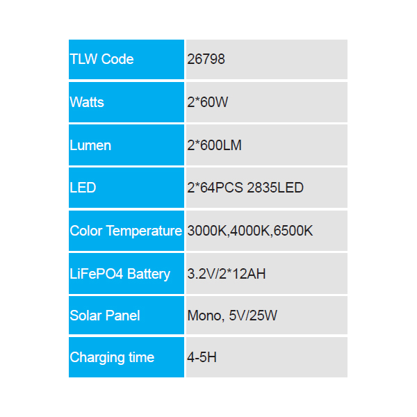 | Extended description: | Lasts for 10-20 hours with a 5 hour charge 3 Colour setting 3000k/4000k/6000k Adjustable brightness Adjustable working time Lifespan of 35 000 hours 2 x 64 leds Battery – 3.2V/12AH Solar panel – 5V/16W 2 Year warranty Install in minutes – no DIY skills required Automatic operation at dusk |